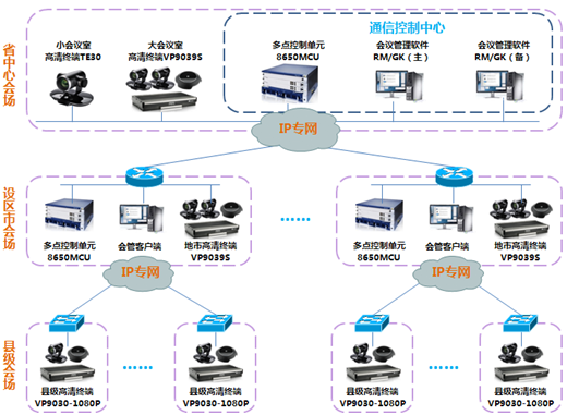 1. 背景簡介 金融機構(gòu)早期已建設(shè)標清視頻會議系統(tǒng),已使用多年,該視頻會議系統(tǒng)在金融機構(gòu)的日常會議和培訓交流等需求中發(fā)揮重要作用。但是該系統(tǒng)功能簡單、清晰度不足等問題也困難客戶多時,所以金融機構(gòu)亟需對現(xiàn)有系統(tǒng)進行升級改造。 2. 系統(tǒng)建設(shè)要求 省中心和地市MCU全部升級為支持1080P,具有強大多分屏能力的MCU,管理軟件統(tǒng)一部署(管理軟件服務(wù)器熱備份),分級分權(quán)下放到各地市,全省78個會場(省中心2個,設(shè)區(qū)市會場9個,縣級會場67個)全部換成支持1080P的高清視頻會議終端,形成以省中心為主體、各分支機構(gòu)為節(jié)點,統(tǒng)一的視頻通訊系統(tǒng)平臺。 3. 技術(shù)解決方案